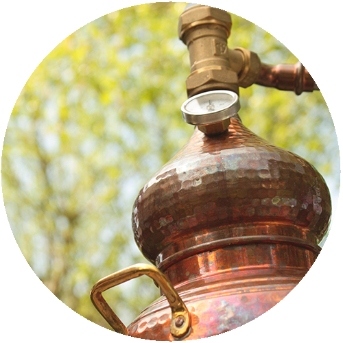 Unsere Hydrolate werden mit einer Kupferdistille hergestellt. Hierfür werden die Pflanzenteile in den Kolben mit hochwertigem Quellwasser (aus der Lauretana-Quelle) gegeben und erhitzt – bei einigen Pflanzen, wie z.B. Lavendelblüten werden sie in einen Aromakorb über den Kolben gefüllt. Der heiße Wasserdampf löst nun bei seinem Auftsieg die löslichen Stoffe aus der Pflanze, kondensiert am Kühler und tropft als Hydrolat in das Auffanggefäß. Die Hydrolate werden dann in Braunglasflaschen abgefüllt und mit einem Sprühaufsatz verschlossen.